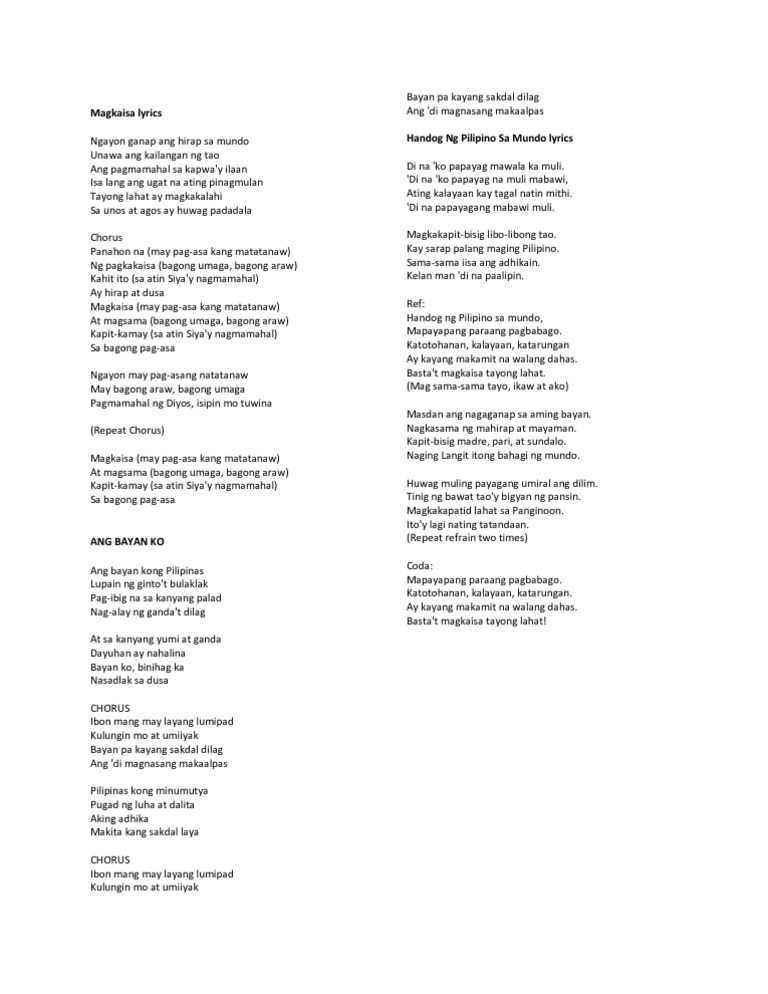Ang bayan kong Pilipinas Lupain ng gintot bulaklak Pag-ibig ang sa kanyang palad Nag-alay ng gandat dilag At sa kanyang yumi at ganda Dayuhan ay nahalina Bayan ko binihag ka Nasadlak sa dusa Ibon mang may layang lumipad Kulungin mo at umiiyak Bayan pa kayang sakdal-dilag Ang di magnasang makaalpas Pilipinas kong minumutya Pugad ng luha at dalita Aking adhika. Makita kang sakdal laya AD LIB CHORUS Thanks. Pugad ng luha at dalita.