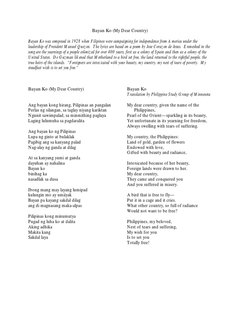 Bayan Ko My Dear Country Bayan Ko Pdf Philippines